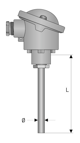 | Mittaussauva | Vaihdettava mittaussauva tyyppiä TR 100 haponkestävästä teräksestä D = Ø 6 mm. Mittaussauvan pituus = L + 10 mm. Täydelliset tekniset tiedot mittaussauvoista (TR 100). |