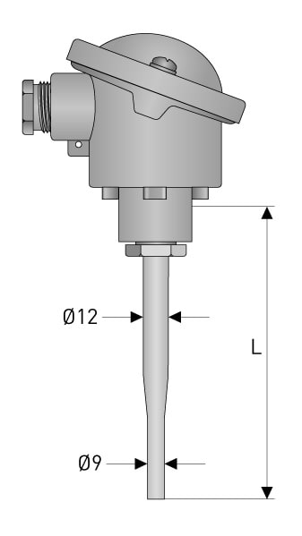 | Mittauselementti | Vaihdettava mittaussauva tyyppiä TC 100 haponkestävästä teräksestä D = Ø 6 mm. Mittaussauvan pituus = L + 10 mm. Täydelliset tekniset tiedot mittaussauvoista (TC 100). |