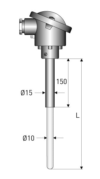 | Mittaussauva | Mittauselementti tyyppi K: Vaihdettava sauva TC 100 Inconel 600 / 2.4816, Ø 6 mm. Eristetty mittauspiste. Mittaussauvan pituus= L + 25 mm. Lisätietoa katso TC 100. Mittauselementti tyyppi S: Termopari asennettuna keraamiseen eristyssauvaan. Mittaussauvan pituus = L + 20 mm. |