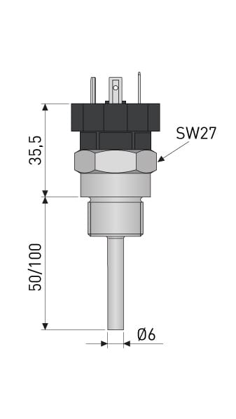 Kompaktianturi on valmistettu ruostumattomasta teräksestä 1.4404/316L. Prosessiliitäntä G1/2″ kierre. Anturielementti Pt100 ohutkalvo, DIN EN 60751 mukaan. Anturin sähkökytkentä EN 175301-803 liitin.