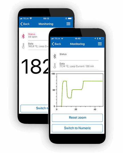 Langaton konsepti on erinomainen työkalu henkilöille, jotka työskentelevät huollon ja ylläpidon parissa, sillä se tarjoaa mahdollisuuden nopeaan prosessin tarkasteluun. INOR Connect -sovelluksen reaaliaikainen seuranta ja diagnostiikka mahdollistavat prosessilämpötilan reaaliaikaisen seurannan. Sovelluksessa näet myös ympäristön lämpötilan ja syöttöjännitteen, jolle lähetin on altistunut. Näin voit havaita piikit, jotka voivat vahingoittaa prosessin hallintaa.